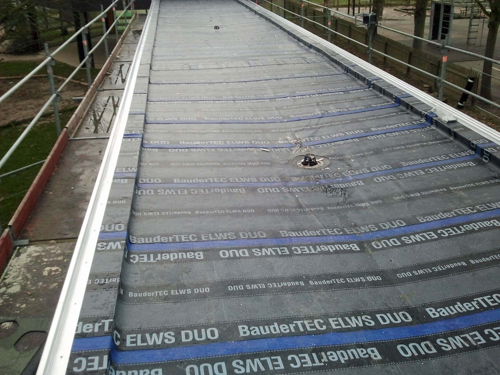 Flachdachfläche mit einer Kaltselbstklebebahn(als 1.Abdichtungslage) und einem Aluminium-Dachrandprofil
